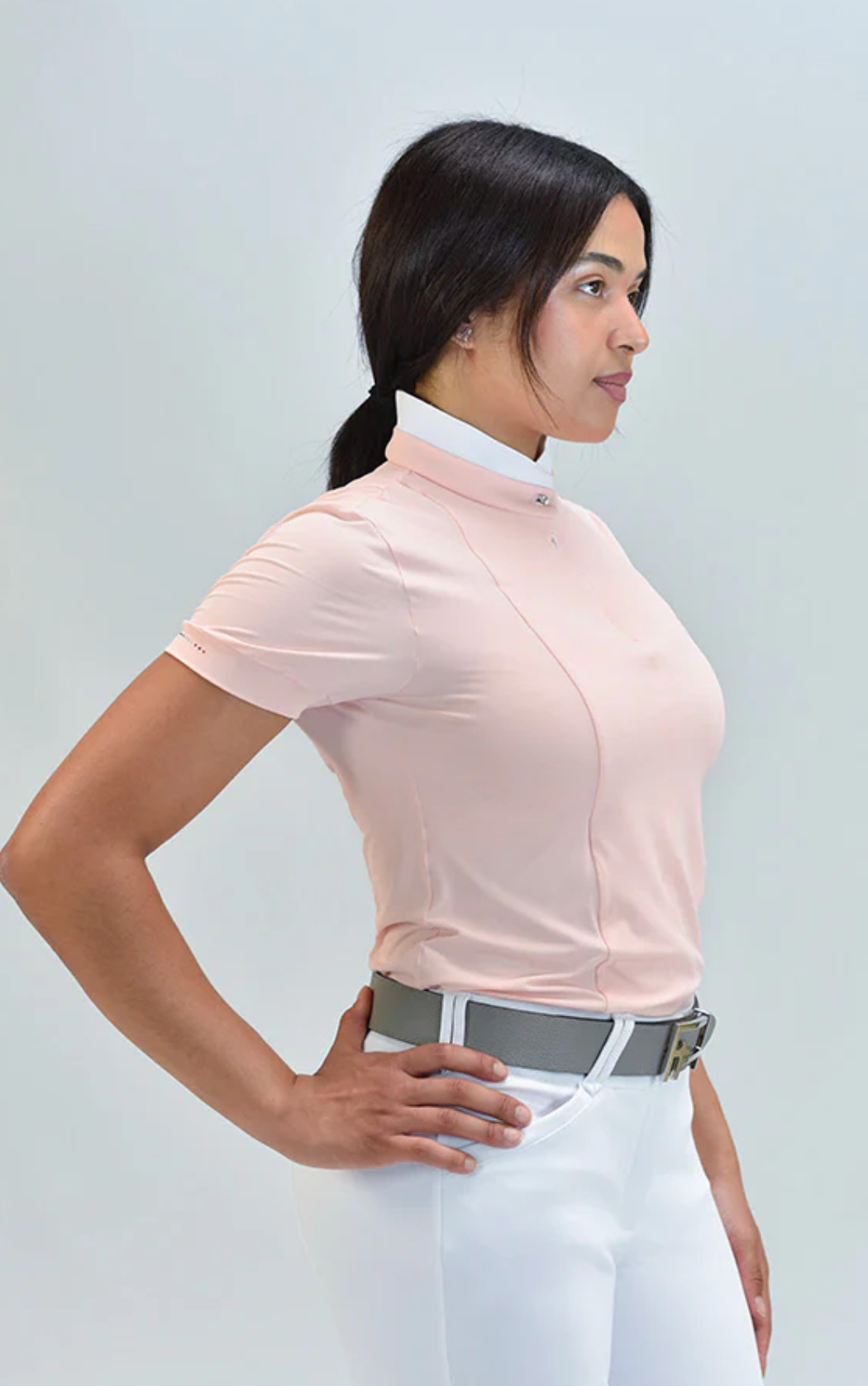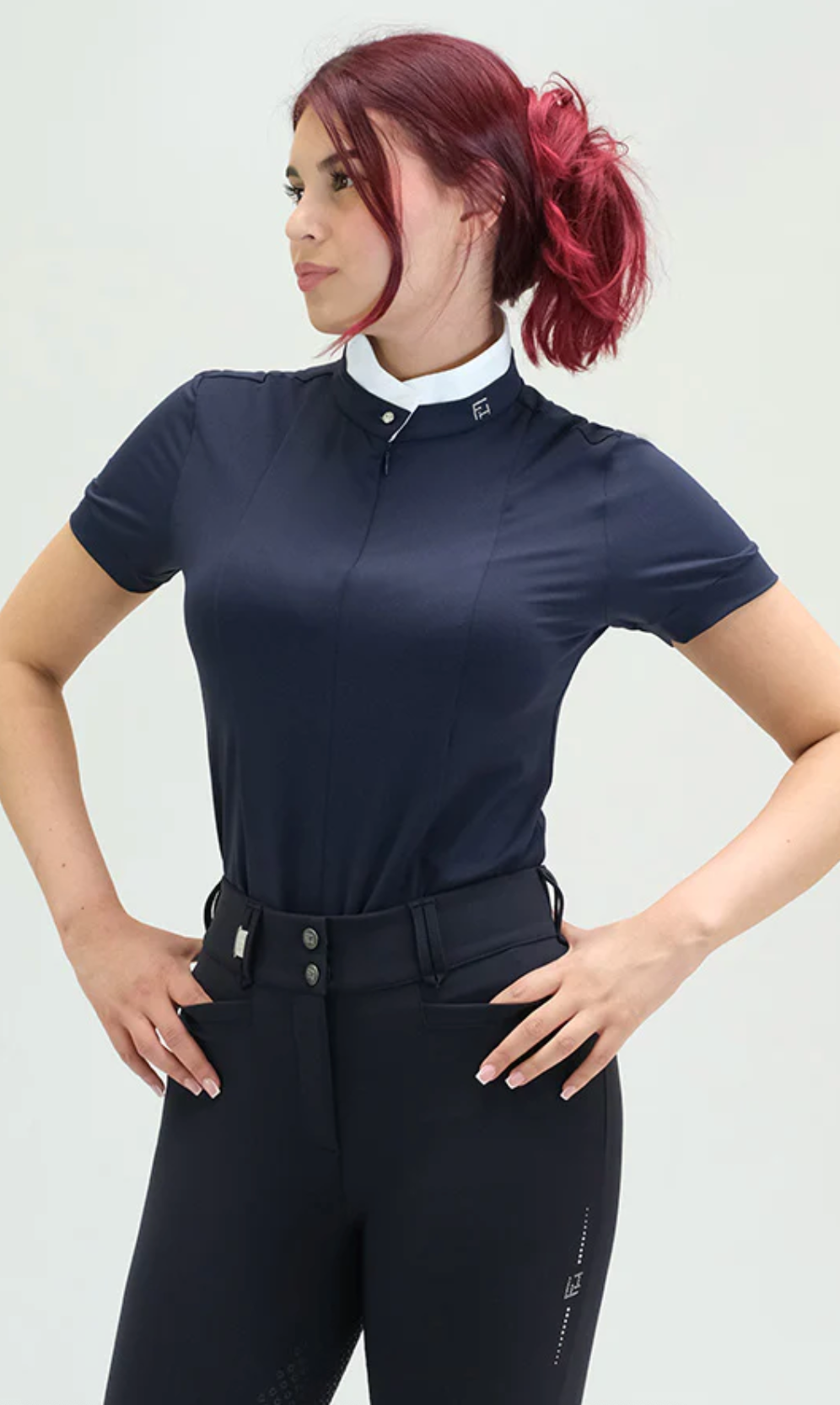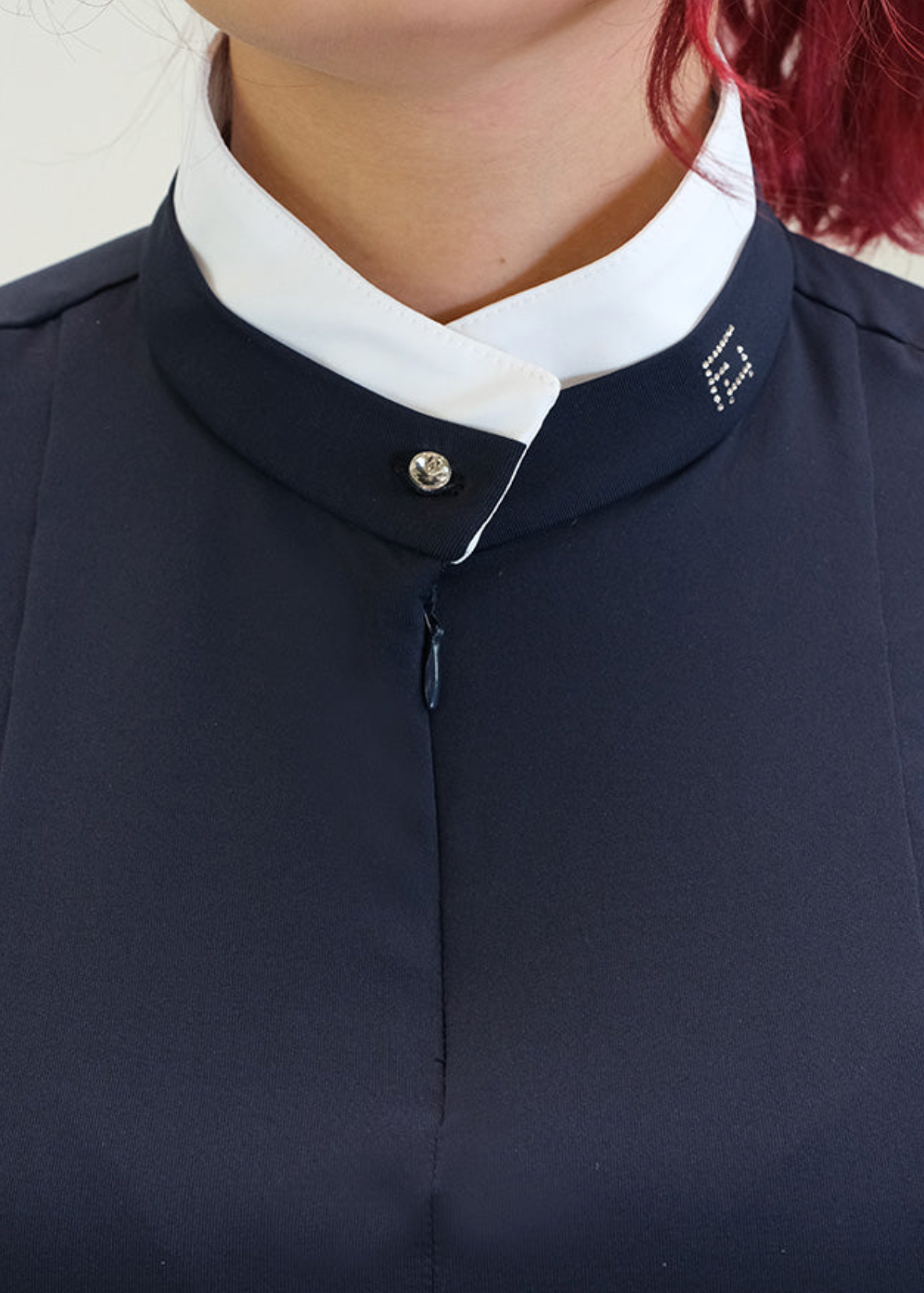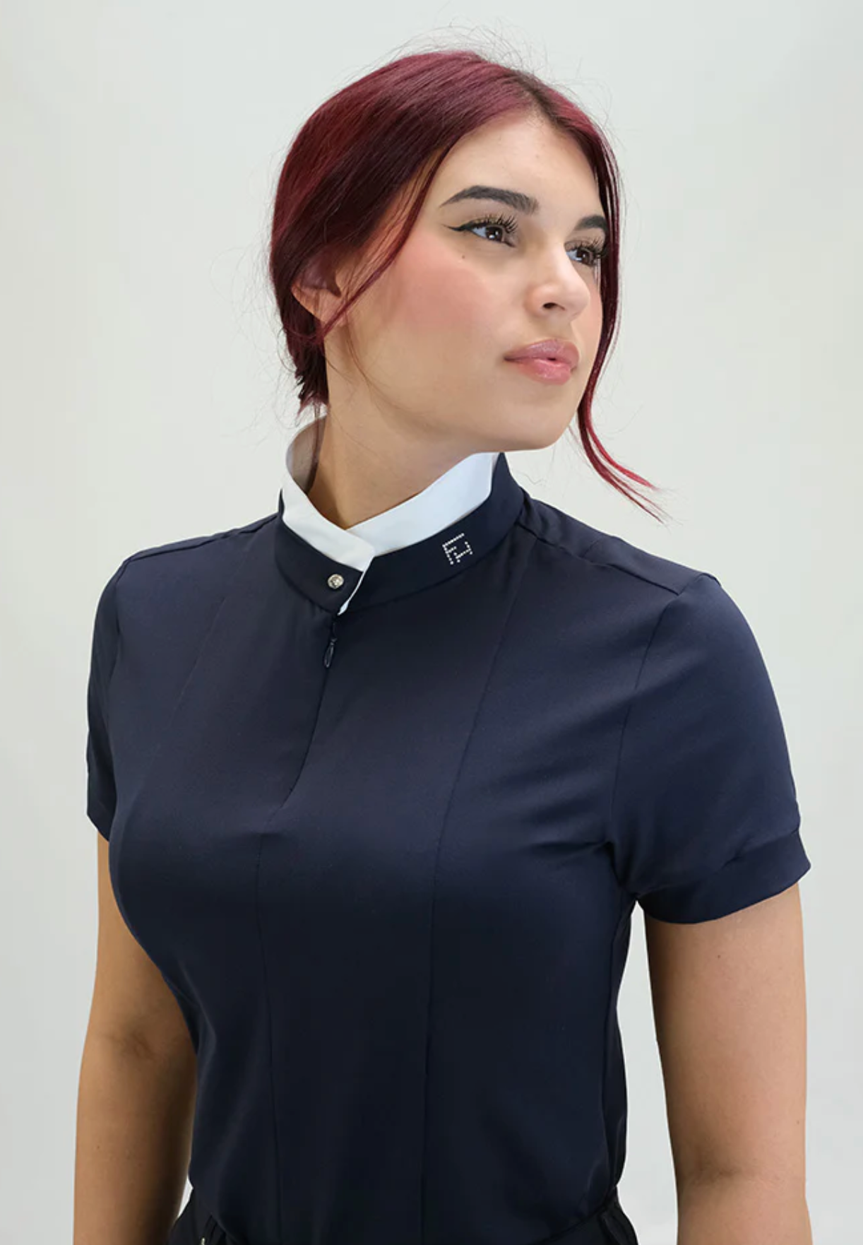 ARPA is a Silky Move short sleeve shirt, with a double layer collar that closes with a crystal button and has a hidden front half zip. A must-have item for equestrians, with extra comfort, breathability and high UV protection, perfect for Jumpers and Dressage riders.