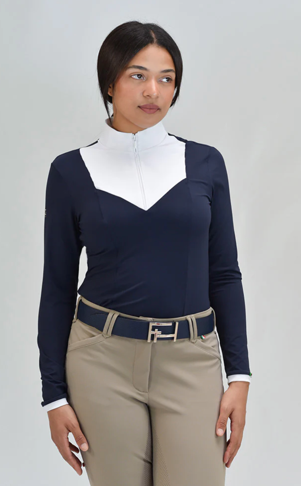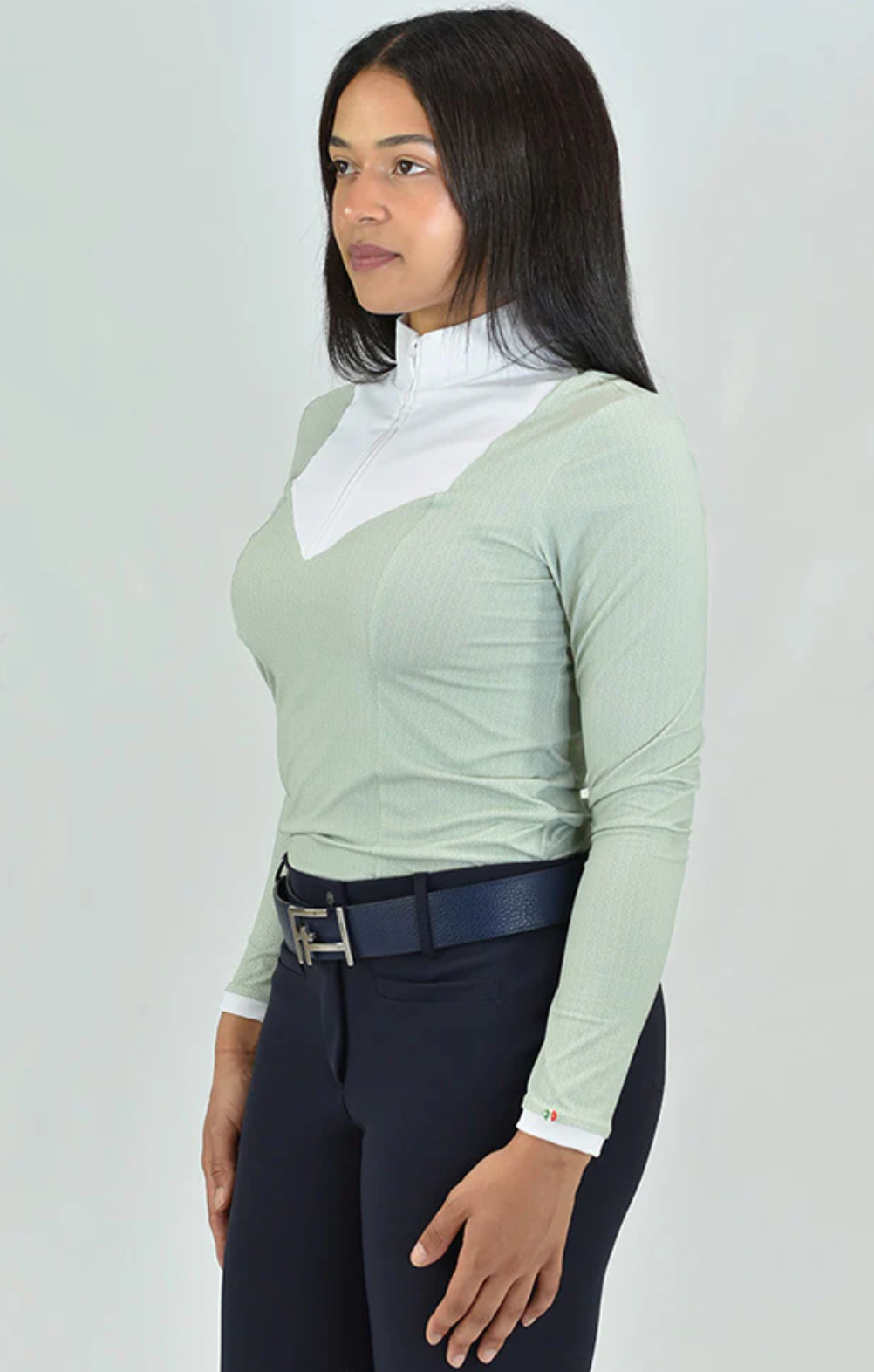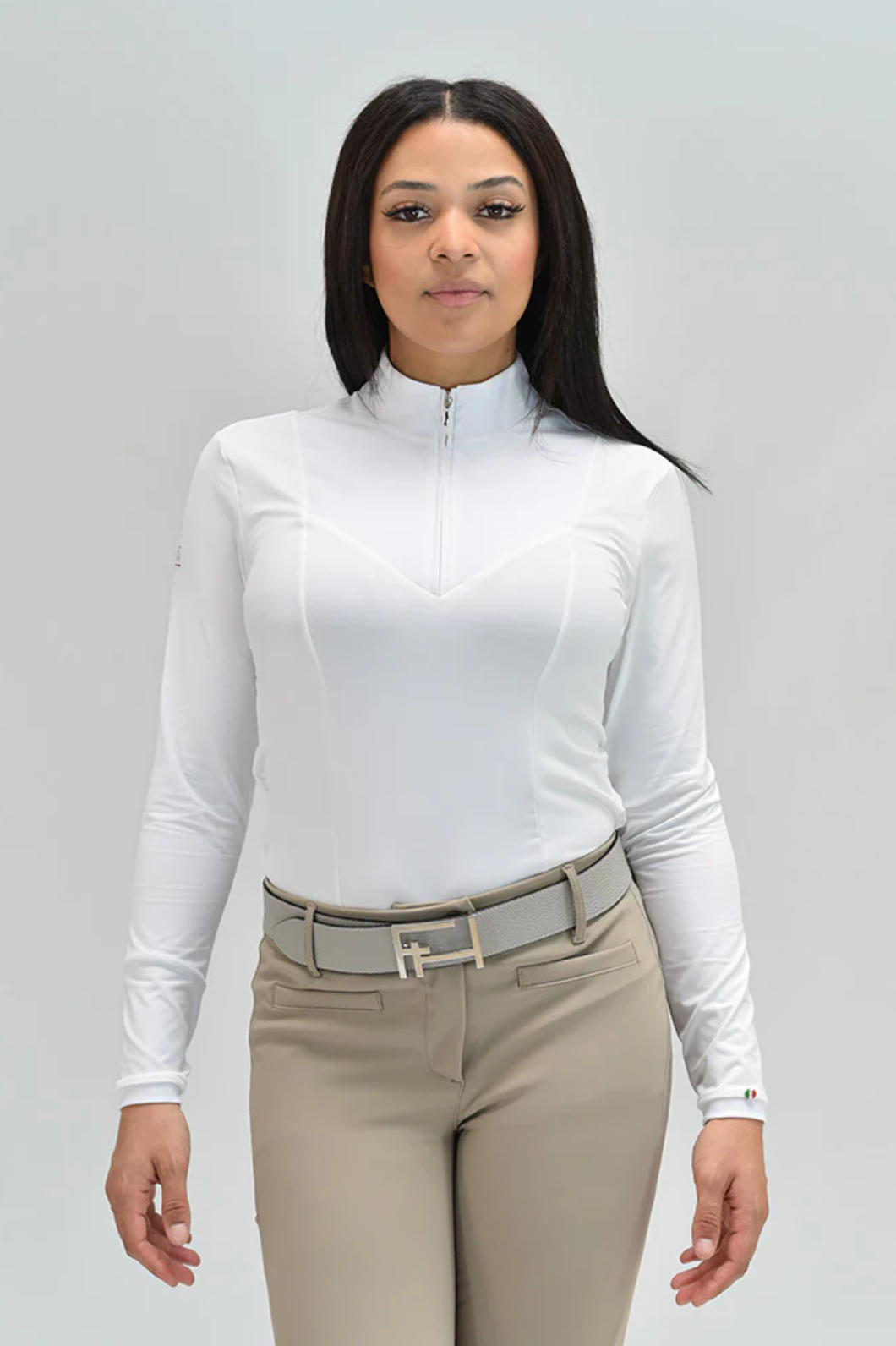 ELDA is a Silky Move long sleeve shirt, with a high white collar and flattering front panel that closes with a hidden front half zip. A must-have item for equestrians, with extra comfort, breathability and high UV protection, perfect for Jumpers and Dressage riders.