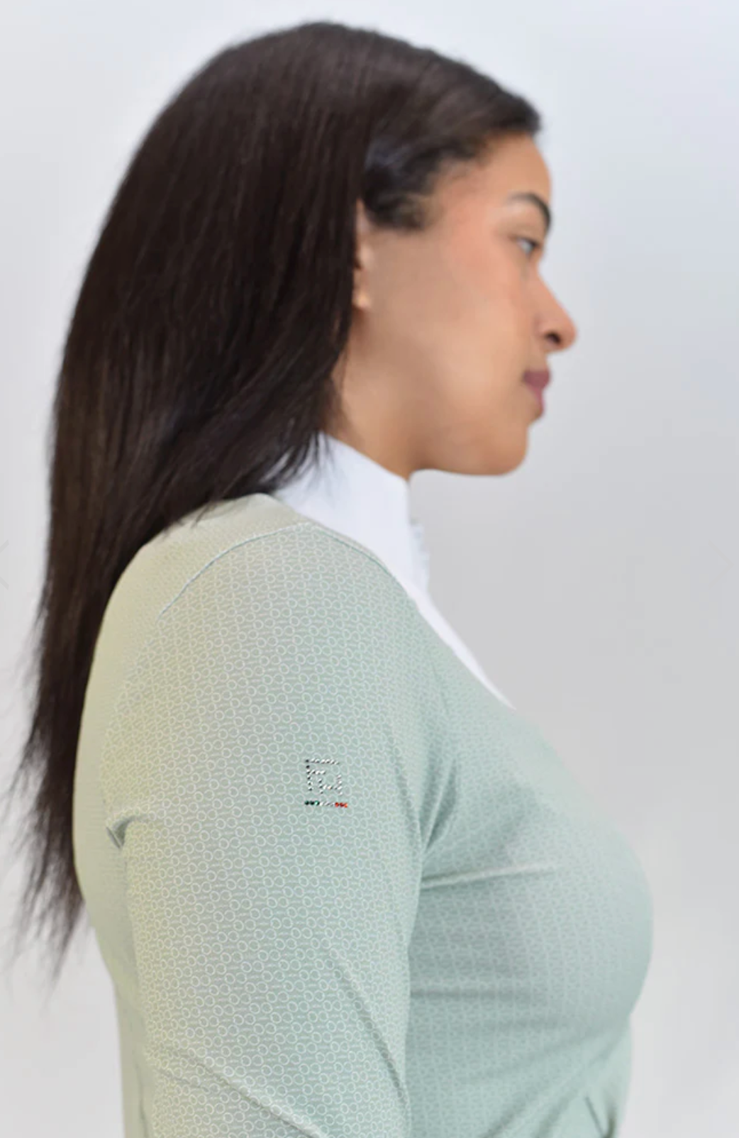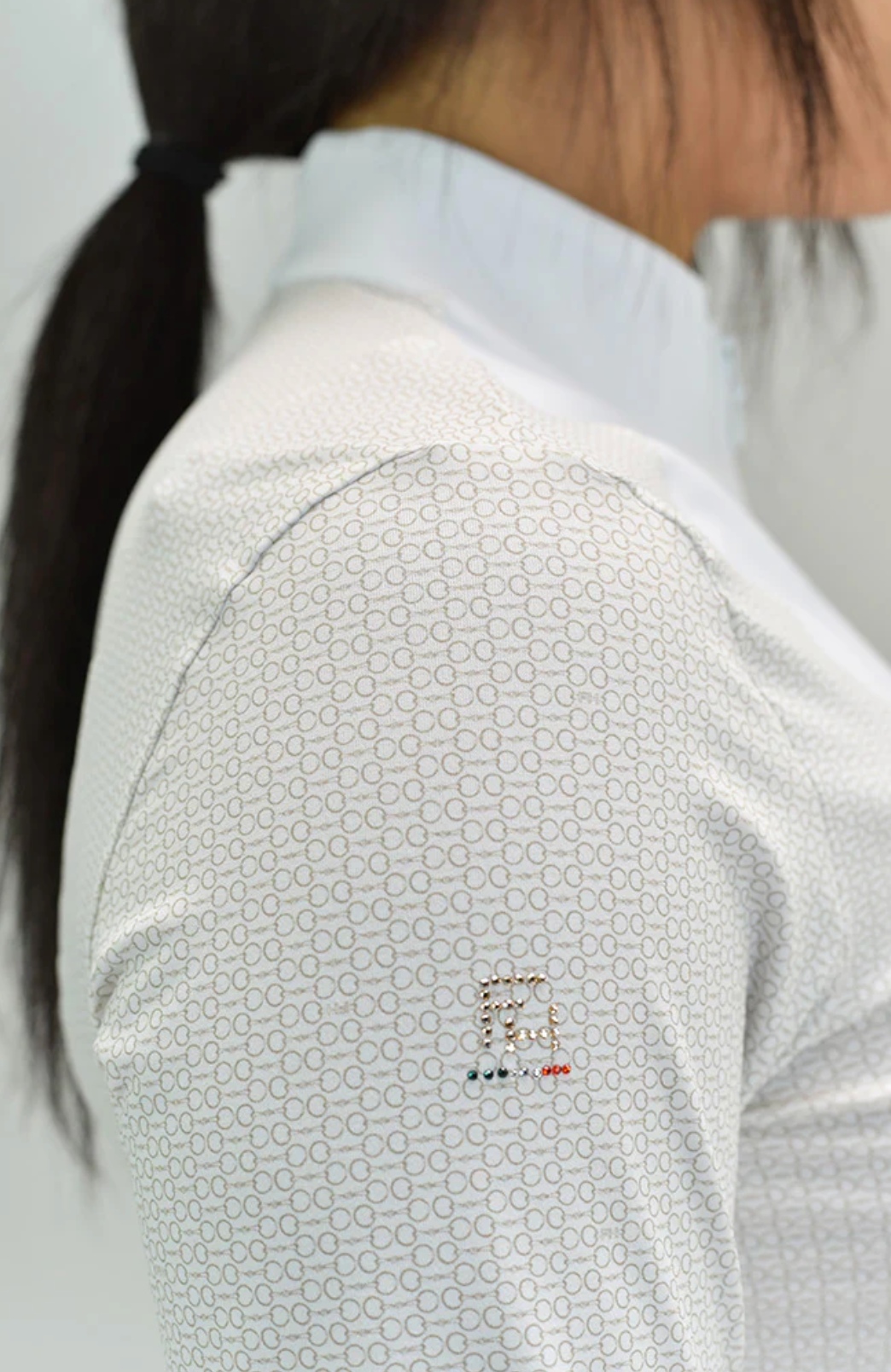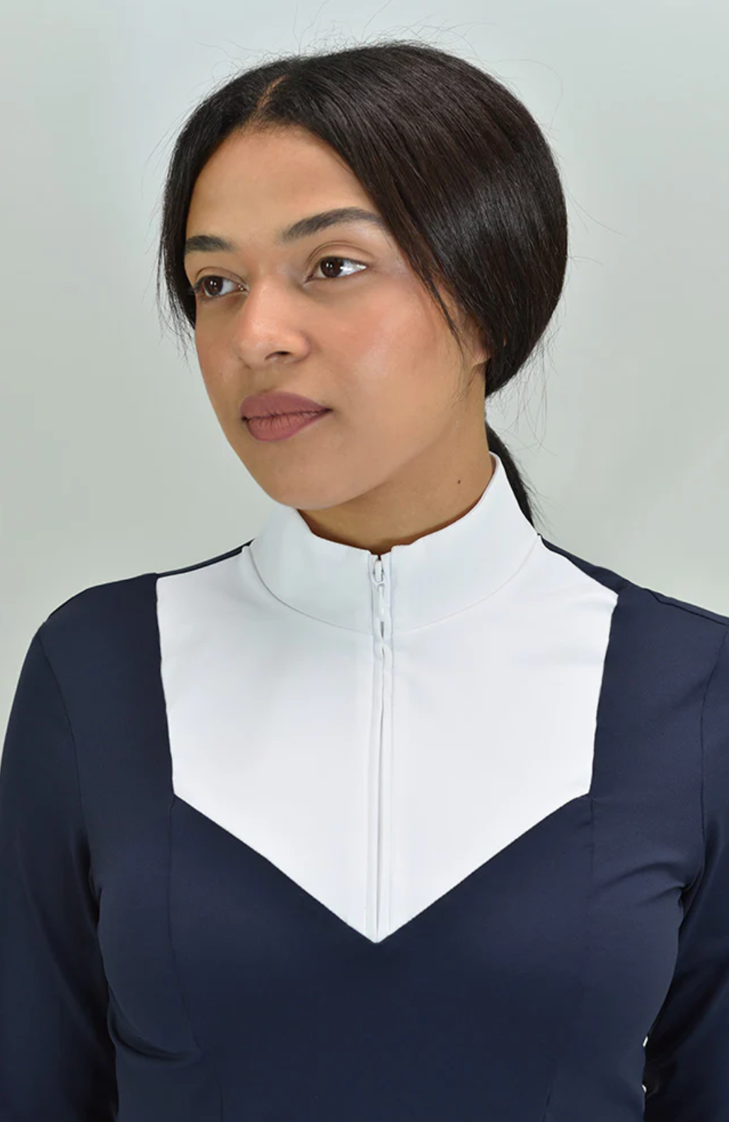 ELDA is a Silky Move long sleeve shirt, with a high white collar and flattering front panel that closes with a hidden front half zip. A must-have item for equestrians, with extra comfort, breathability and high UV protection, perfect for Jumpers and Dressage riders.