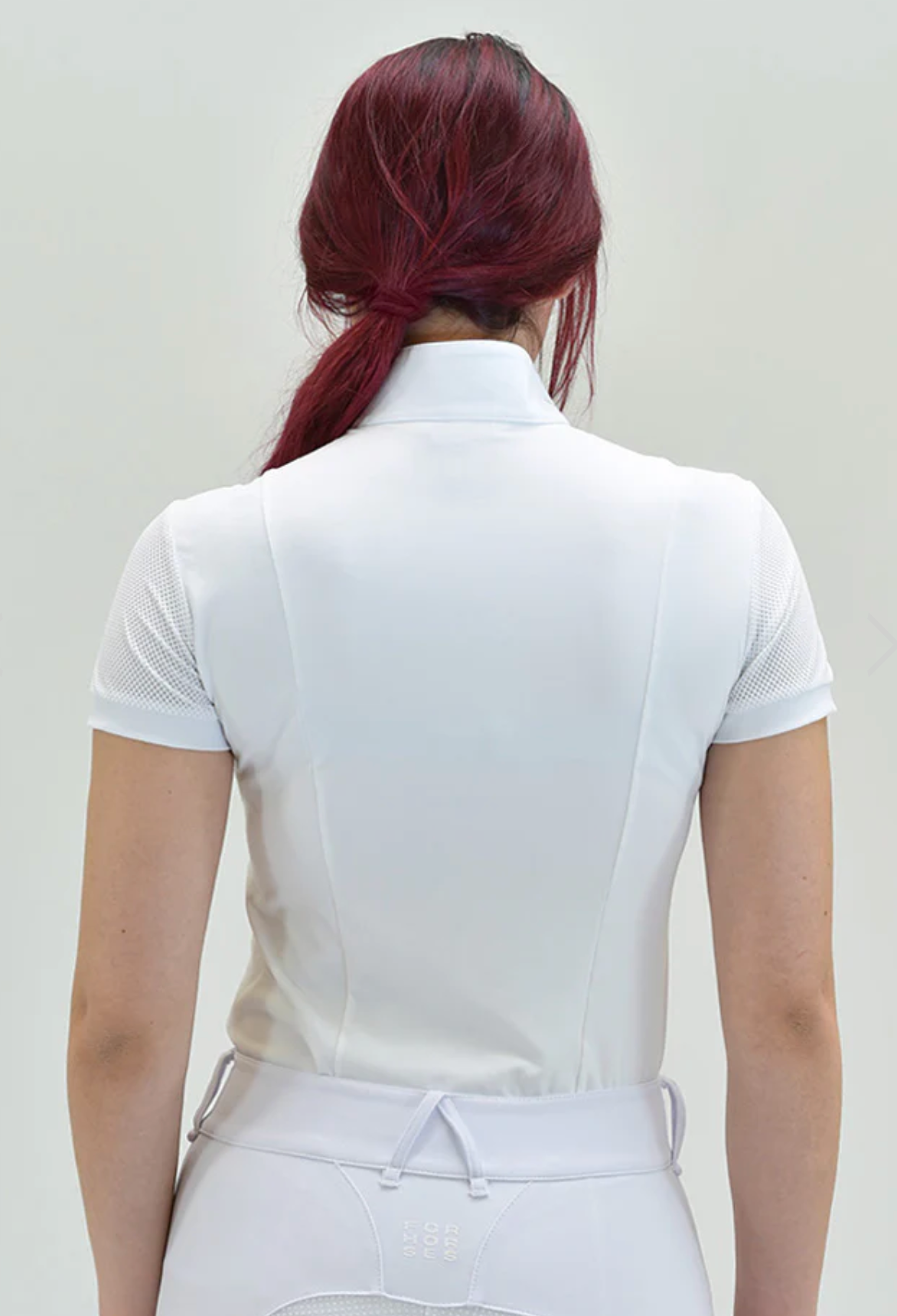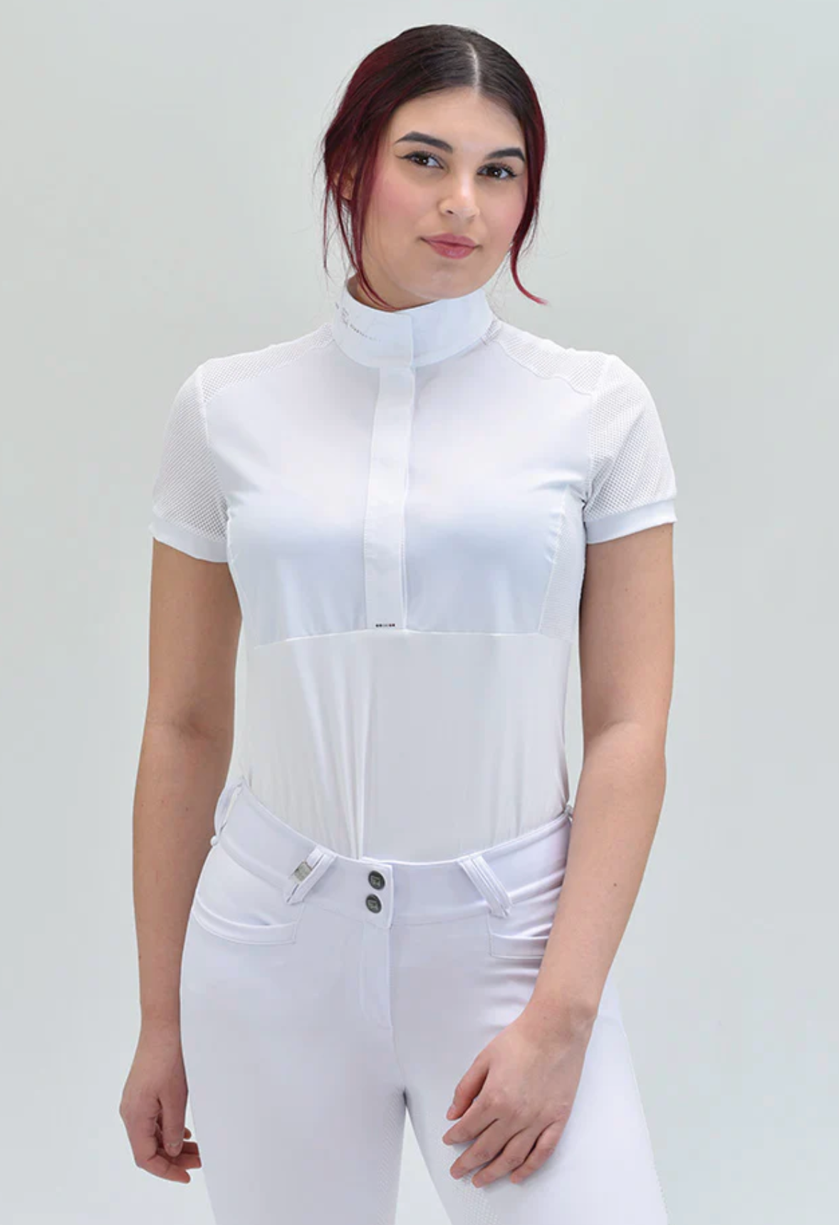 MELA is a Silky Move show shirt with a white lycra bib and soft micro perforated fabric details on the shoulder, sleeves and side panels. Extra comfort, bielastic, breathability and UV protection are the core features of this shirt, perfect to be worn under a show jacket or alone.